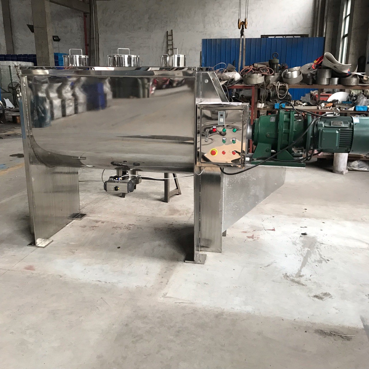 b.Hệ thống tải: Để làm cho việc vận hành máy xay ribbon công nghiệp thuận tiện hơn, tất cả đều có cầu thang cho máy trộn kiểu nhỏ, bệ làm việc có bậc cho máy trộn kiểu lớn hơn, hoặc bộ cấp vít để nạp tự động.