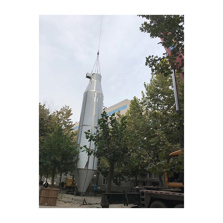 Nguyên liệu dạng lỏng được đưa vào thông qua máy bơm áp suất cao, được phun ra thành những giọt nước mỏng và phun ra, sau đó nó hòa hợp với không khí nóng và rơi xuống.Phần lớn hạt bột được thu gom từ cửa xả ở đáy thiết bị.Không khí thải và bột mịn được tách qua xyclon, không khí thải được thải ra từ quạt hút và bột mịn được thu gom ở đáy xyclon.Tại cửa ra, có một bộ lọc bụi đi-ốt được trang bị;do đó, tỷ lệ thu gom hạt bột thành phẩm luôn ở mức cao từ 96% đến 98%.